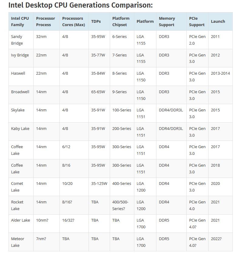 المعالجات الجديدة سوف تدعم بروتوكول PCI-e Gen 4.0 . يمكن للمعالج أن يحقق أداءً أفضل (لكنه يعمل بالفعل بدرجات حرارة مرتفعة حتى مع 8 أنوية فحسب مما يؤدي إلى زيادة استهلاك الطاقة للمعالج بشكل كبير) . تم زيادة أحجام ذاكرة التخزين المؤقت L1 وذاكرة التخزين المؤقت L2 . نواة الجيل العاشر L1 32KB / L2 256KB بينما نواة الجيل الحادي عشر L1 48KB / L2512KB . الجدير بالذكر أيضاً أن الجيل الحادي عشر يعمل مع تقنية تصنيع 14 نانومتر ، إلا أن هناك تغييرًا حقيقيًا في الأداء . طبقاً للتسريب أيضاً فقد حسّنت الهندسة المعمارية الجديدة الأداء مع الألعاب بشكل جيد (ولكن لم يتم ذكر أية قيمة لهذه الزيادة).