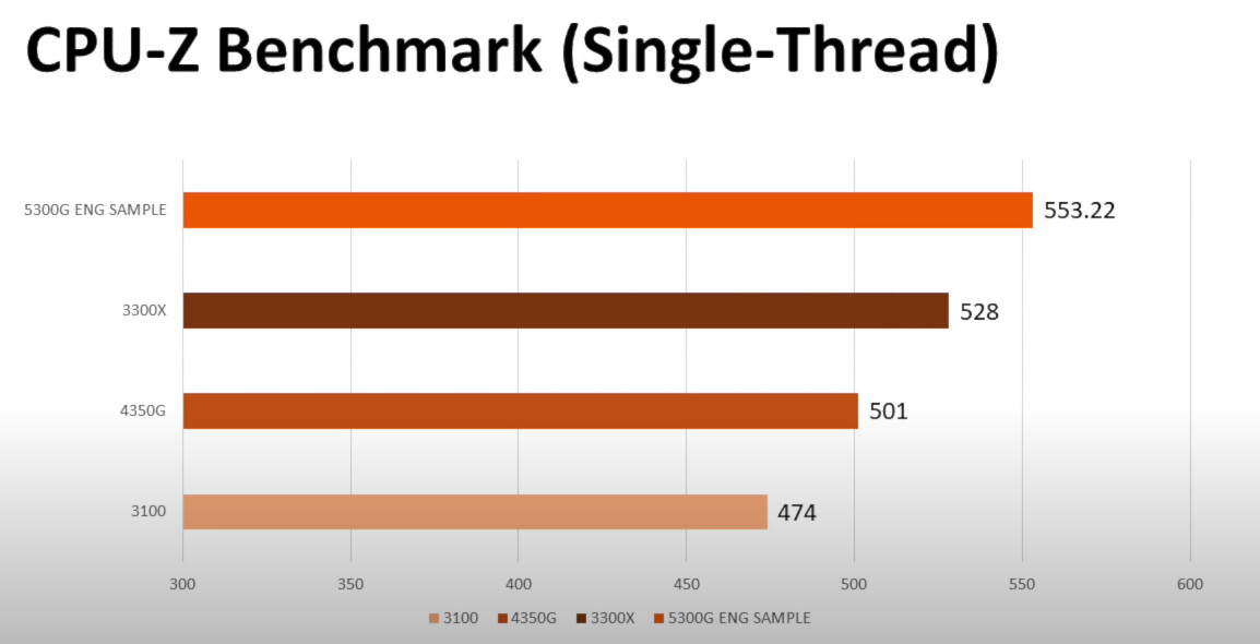 تم وضع المعالج تحت الاختبار باستخدام إختبار الأداء الأحادي في برنامج CPU-Z ، ويظهر المعالج تحسنًا بنسبة 10.4٪ مقارنة بمعالج مثل 4300G، بينما في أداء الخيوط المتعددة يتمتع المعالج بزيادة في الأداء بنسبة 7.9٪ . أما في برنامج Cinebench R15 ، فيتفوق 5300G على Ryzen 3 Pro 4350G بنسبة 16.7 ٪ وعلى Intel Core i3-10100 بنسبة 11.6 ٪.