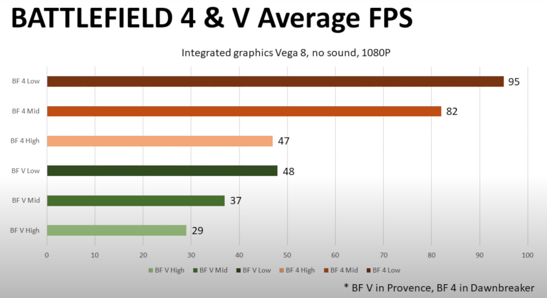 للأسف لم نصل إلا على نتيجتين للألعاب فقط، حيث أنه في لعبتي Battlefield 4 و Battlefield V إستطاع المعالج مع أداء المعالج الرسومي المدمج من سلسلة Vega الوصول -بشكل مثير للإعجاب- إلى عدد 29 إطارًا في الثانية في لعبة Battlefield V بإعدادات عالية مع دقة عرض 1080 بكسل. في حين أنه وعند اللعب بإعدادات رسومية أقل تطلبًا أو مع ألعاب أقدم ، قد نرى بعض الأرقام الرائعة، وهو ما حصل مع اللعبة الثانية حيث إستطاع المعالج الوصول إلى ما يصل إلى 95 إطارًا في الثانية مع لعبة Battlefield 4 بإعدادات منخفضة ودقة عرض 1080 بكسل.