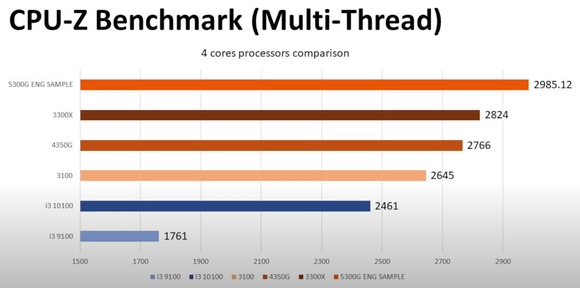 تم وضع المعالج تحت الاختبار باستخدام إختبار الأداء الأحادي في برنامج CPU-Z ، ويظهر المعالج تحسنًا بنسبة 10.4٪ مقارنة بمعالج مثل 4300G، بينما في أداء الخيوط المتعددة يتمتع المعالج بزيادة في الأداء بنسبة 7.9٪ . أما في برنامج Cinebench R15 ، فيتفوق 5300G على Ryzen 3 Pro 4350G بنسبة 16.7 ٪ وعلى Intel Core i3-10100 بنسبة 11.6 ٪.