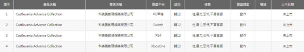 قامت هيئة التصنيف العمري فى تيوان بتصنيف لعبة Castlevania Advance Collection لأجهزة الـ PlayStation 4 و Xbox One و Nintendo Switch والحاسوب الشخصي.