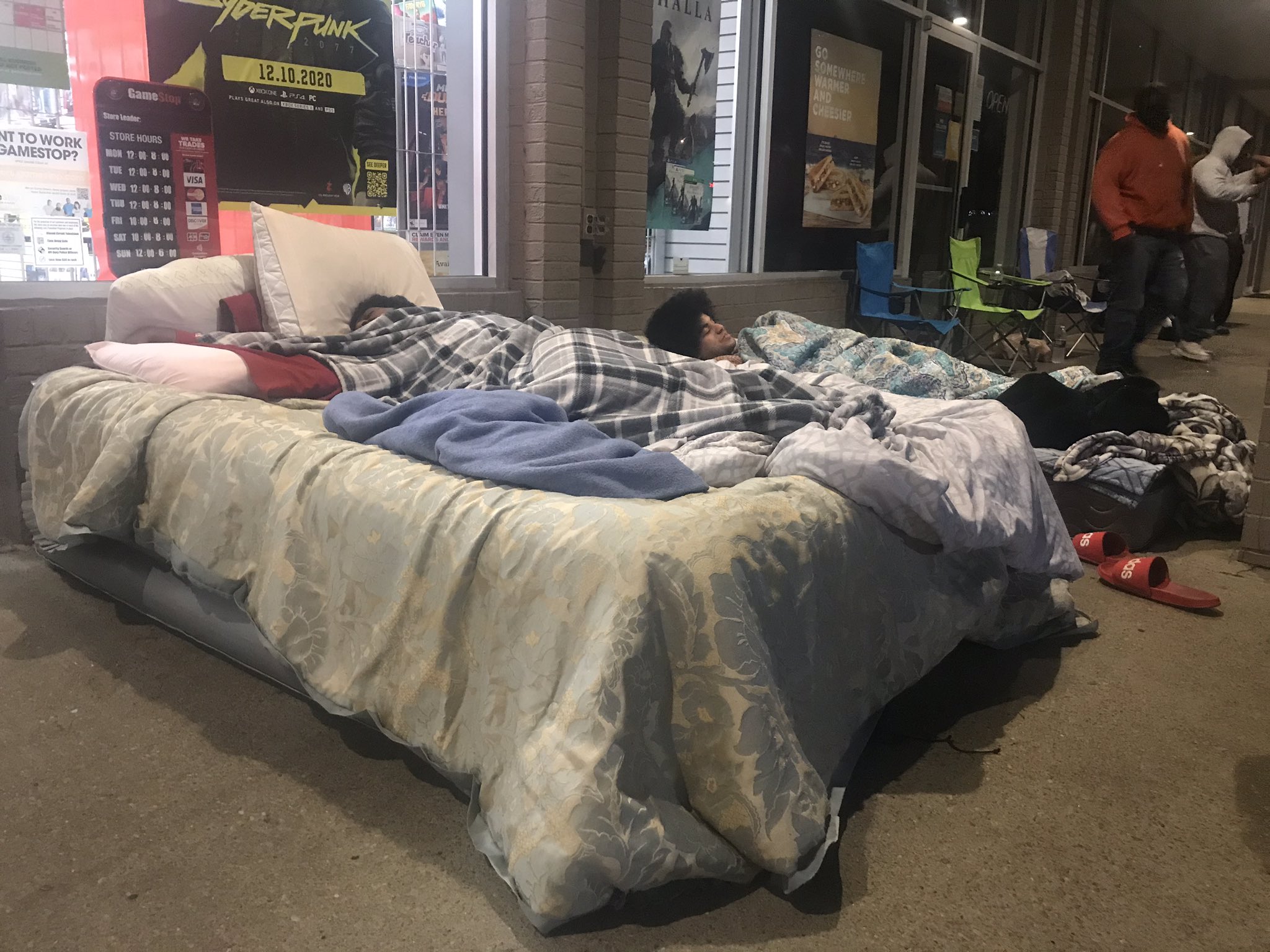 بعد أن أعلن متجر GameStop عن الأمر قرر لاعبان التوجه إلى المتجر بسريرهما الشخصي حتى يضمنان الحصول على منصة PlayStation 5 فور توفرها يوم 27. اللاعبان قاما بالتخييم أمام متجر GameStop لمدة 24 ساعة كاملين وضيعا على أنفسهما عيد الشكر حتى يتحصلان على الجهاز.
